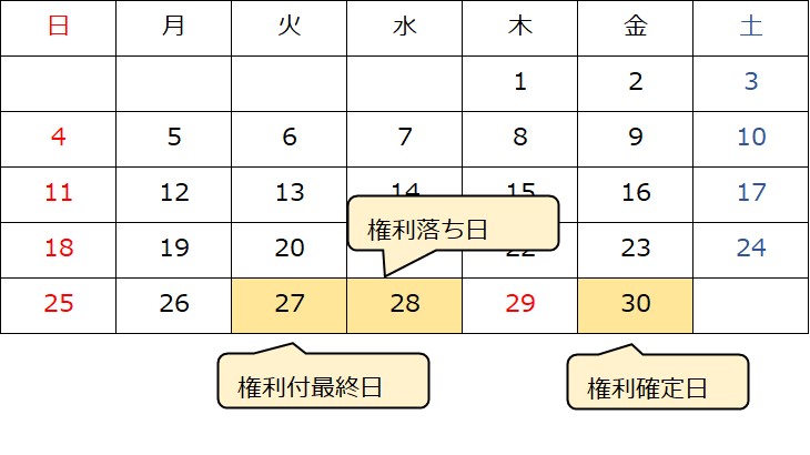 株主がその銘柄を保有することで株主権利(配当金・株主優待など)を得ることができる最終売買日の翌営業日を指します。